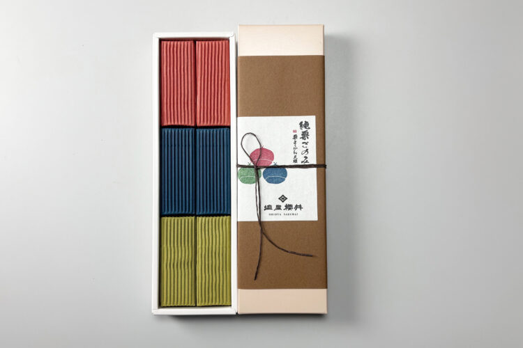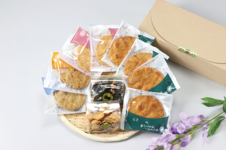 松印×4枚、ゴマ×1枚、青のり×1枚、ザラメ×2枚、千成ひょうたん醤油×1袋、品川巻き×1袋