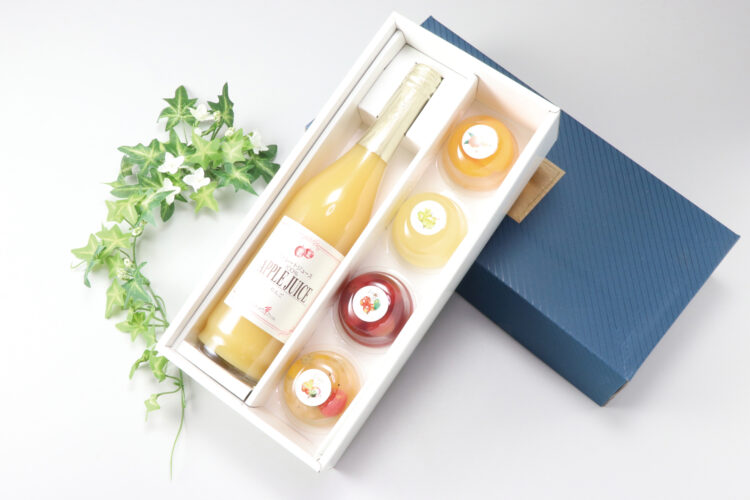 ジュース500ml(りんご)×1本、フルーツゼリー95g、(ラ・フランス、さくらんぼ、フルーツミックス)各1個、フルーツゼリー90g(あんず)×1個