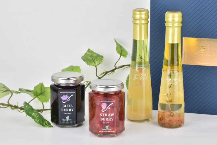 フルーツジャム145g×2個(ストロベリー、ブルーベリー)、ドレッシング122ml×2本(フレンチガーリック、イタリアンハーブ)
