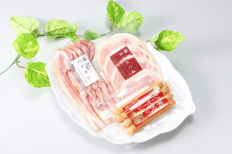 米沢ロースハム90g、米沢ベーコン100g、米沢牛入りソーセージ120g