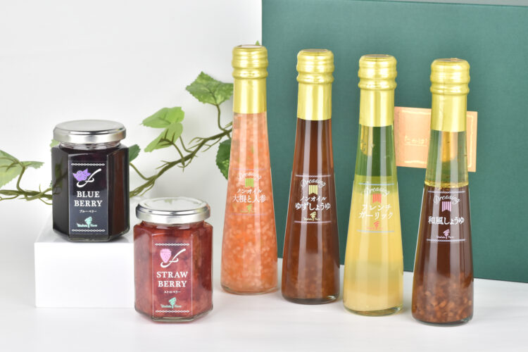 フルーツジャム145g×2個(ストロベリー、ブルーベリー)、ドレッシング122ml×4本(フレンチガーリック、和風しょうゆ、ノンオイル大根と人参、ノンオイルゆずしょうゆ)