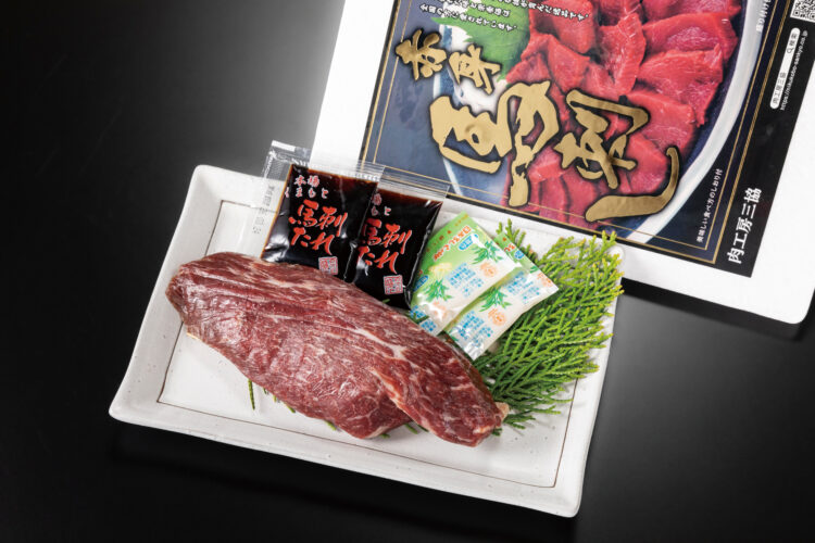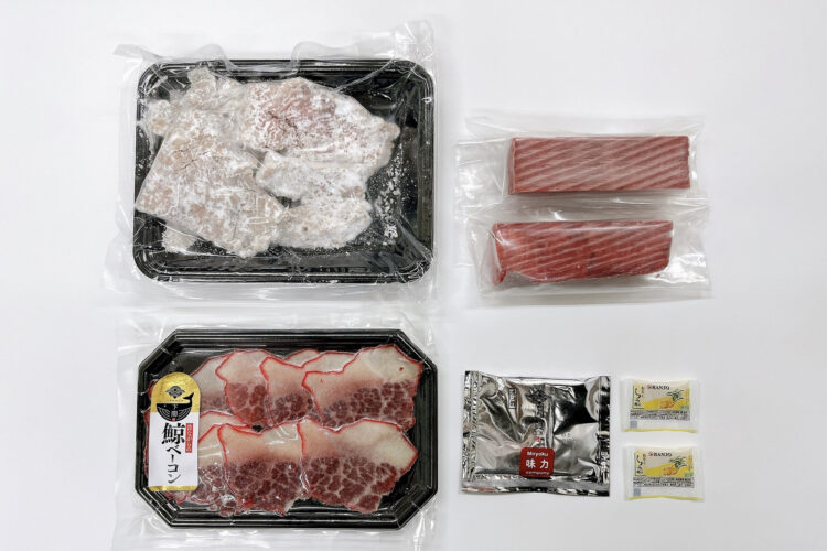 鯨刺身用鯨赤肉100g×2、鯨畝須ベーコン40g、鯨竜田揚げ150g、ポン酢30g、おろししょうが2.5g×2
