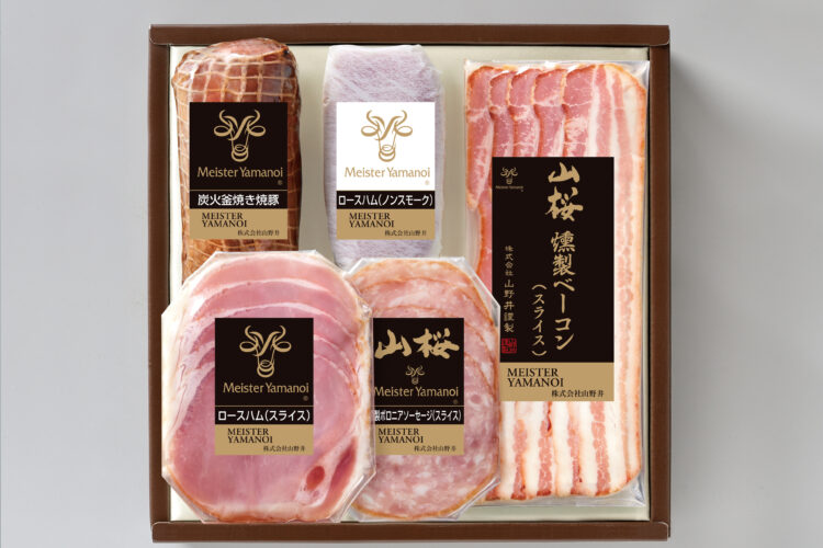 炭火釜焼き焼豚160g、ロースハム(スライス)40g、山桜燻製ボロニアソーセージ(スライス)40g、ロースハム(ノンスモーク)60g、山桜燻製ベーコン(スライス)45g