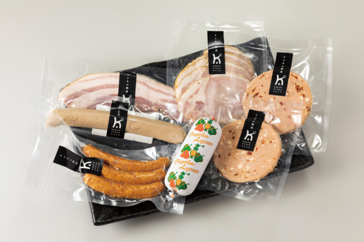 ロースハムスライス55g、燻しベーコンステーキ45g、リヨナーステーキ(トマト&チーズ)60g×2、パプリカリヨナー180g、あらびきウインナー93g、ドイツ屋台の白い焼きソーセージ100g