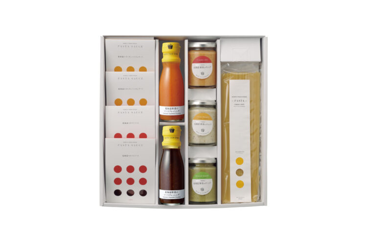 北海道のトマトソース、北海道のオニオンペペロンチーノ 各2個、パスタスパゲッティ、野菜のディップ(トマトチリ・オニオンマスタード・ブロッコリーワサビ)各1個、ソースドレッシング(オニオン・キャロット)各1個