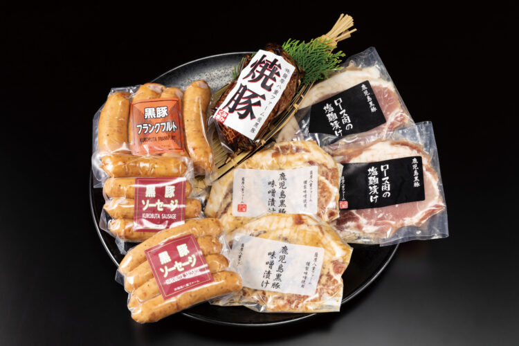 黒豚ロース味噌漬け×2枚、黒豚ロース塩麹漬け×2枚、黒豚の焼豚×1本、黒豚ソーセージ×2P、黒豚フランクフルト×1P
